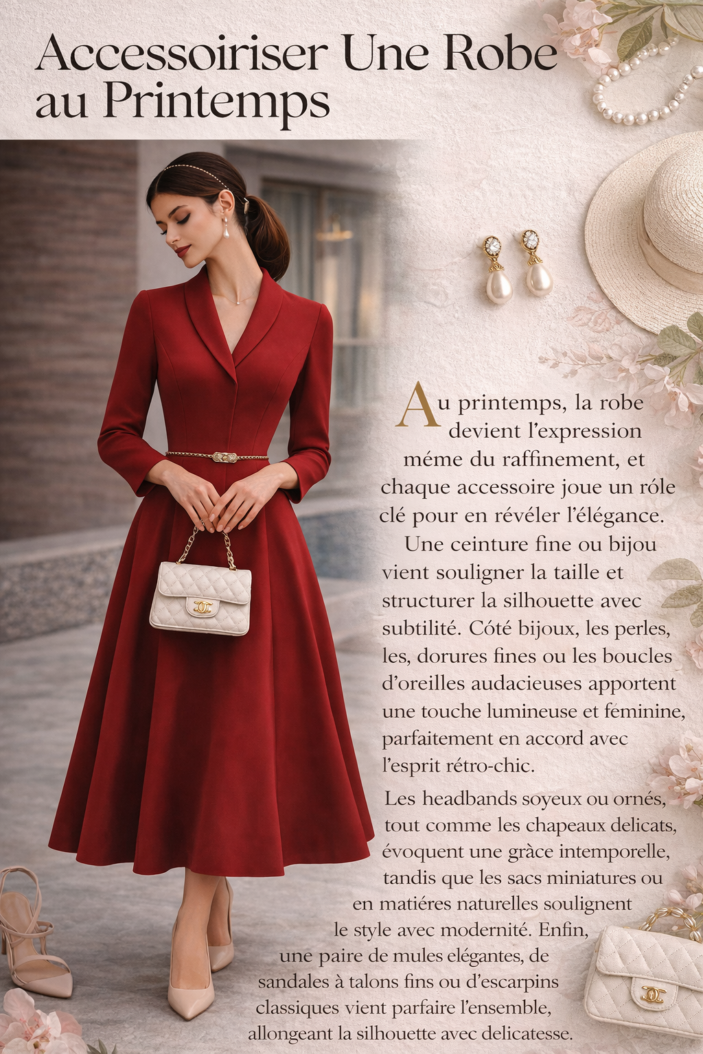 When spring arrives, our dresses take center stage. Light, fluid or structured, they sometimes speak for themselves... In spring, the dress becomes the epitome of refinement, and each accessory plays a key role in revealing its elegance. A fine or jeweled belt highlights the waist and structures the silhouette with subtlety. On the jewelry side, pearls, fine golds or bold earrings bring a luminous and feminine touch, perfectly in line with the retro-chic spirit. Silky or adorned headbands, as well as delicate hats, evoke timeless grace, while miniature bags or natural materials underline the style with modernity. Finally, a pair of elegant mules, fine heel sandals or classic pumps completes the ensemble, delicately elongating the silhouette. Every detail counts to create a harmonious spring look, between vintage heritage and asserted femininity.